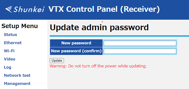 管理者パスワードは、サイドバーより "Management" を選択し、"Update Password" を選択することで変更できます。